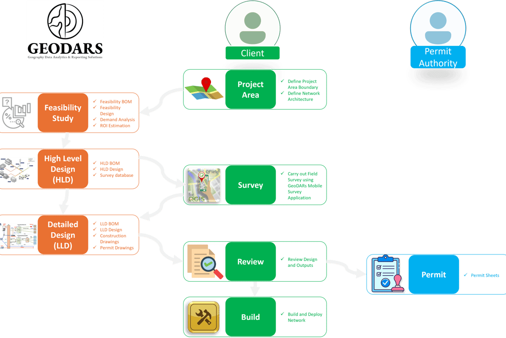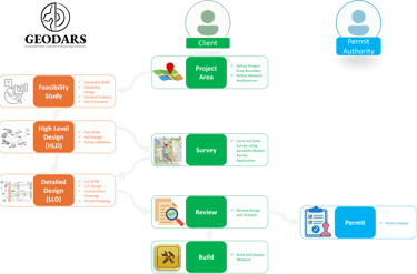 Ensuring compliance streamlined process, highlighting the interaction between clients, survey teams, permit authorities, and our design experts. From defining the project area to final network deployment, GeoDARs ensures every stage is executed with precision and efficiency.