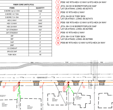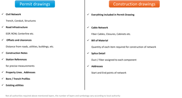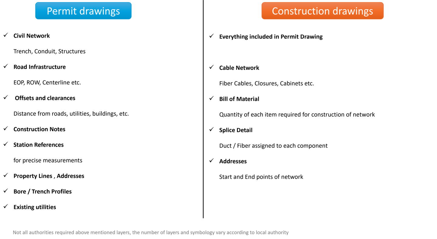 Drawing Production: Drawings are created using platforms like CAD or GIS-based tools, structured with multiple layers (trench, ducts, fiber, structures) and proper legends/symbology.